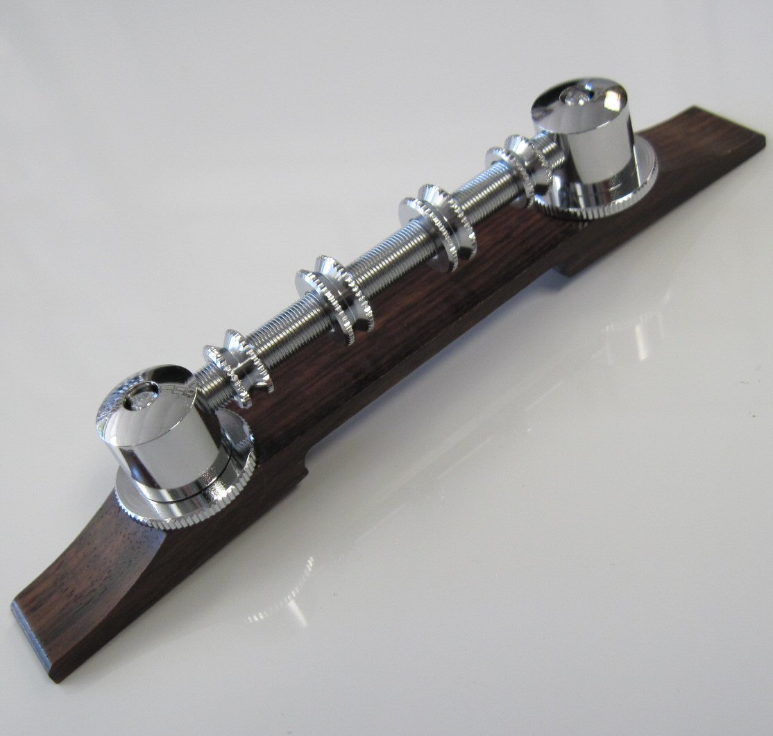 Genuine Gretsch bridge for semi hollow body basses. Rosewood with chrome, grooved, knurled, sideways, adjustable saddles on a fine threaded bar. Bridge fits Gretsch bridge bases with 74mm centers and 20mm thumb wheels. Adjustable string spacing and height.