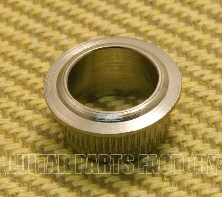 (1) Hipshot nickel HB7 bass string ferrule. Overall Height: 0.427" (10.9mm); Lip Height: 0.099" (2.5mm); Lip Outer Diameter: 0.875" (22.2mm); Barrel Outer Diameter: 0.720" (18.3mm); Barrel Inner Diameter: 0.562" (14.3mm).