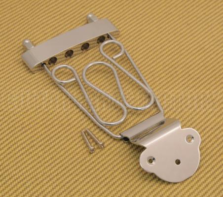 Chrome finish long deluxe style bass trapeze tailpiece. Mounted length is 6-1/4"(159mm). String spread is 1-3/4"(45mm). Requires 1-5/8"(41mm) minimum body thickness. Includes mounting screws.