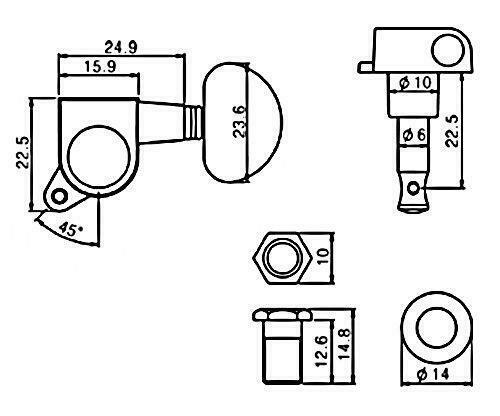 Designed for Epiphone / Gibson LP SG ES guitars, or any project that requires a set of high quality 3 & 3 machine heads. These tuners have a sealed housing & mounting screw hole at 45 degrees. The 1:15 gear ratio, combined with solid brass gears, ensures superior tuning stability and precision over the lower quality hardware typically found on standard & mid-range guitar models.