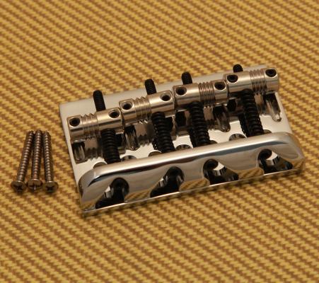 Chrome bridge assembly with three-screw mounting for use on American bass models manufactured from 2007-present (does not retrofit to models with traditional five-screw bridge mounting). This precision manufactured string-through or top load bridge adds sustain, resonance and improved attack thanks to a cold-rolled steel baseplate, high mass brass backstop, and chrome-plated brass "barrel" saddles.